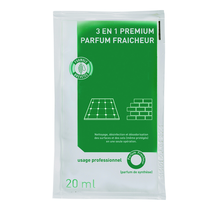 Le 3 en 1 Premium, parfum citron, assure la détergence et la désinfection en une seule opération des sols et des surfaces. Parfum Citron/fraicheur – 20ml.